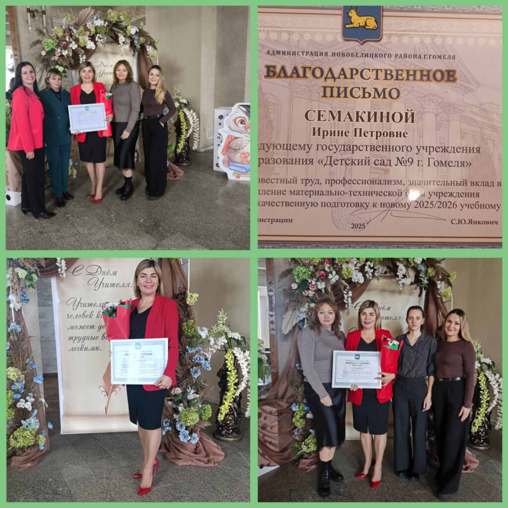 Награждена благодарственным письмом заведующий ГУО «Детский сад № 9 г. Гомеля» Семакина Ирина Петровна — за добросовестный труд, высокий профессионализм и значительный вклад в укрепление материально-технической базы учреждения.